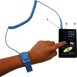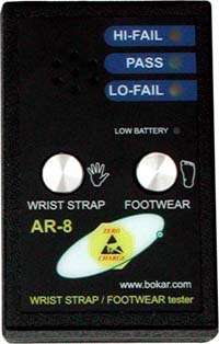 The wrist strap and footwear tester was created to fill a growing demand for a dependable, low cost and easy-to-use test mechanism for personnel grounding devices. It is available as AR-8A Tester, (U.S. standards) a 750-kohms to 10-Mohms range for wrist straps and 750kohms to 100Mohms range for footwear and AR-8E Tester (European standards) a 750-kohms to 35-Mohms range for both wrist straps and footwear.